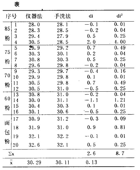 從計(jì)算結(jié)果分析兩種方法的檢驗(yàn)結(jié)果在90%的置信水平時(shí)無顯著性差異,用儀器法測(cè)定面粉的濕面筋值是可行的。