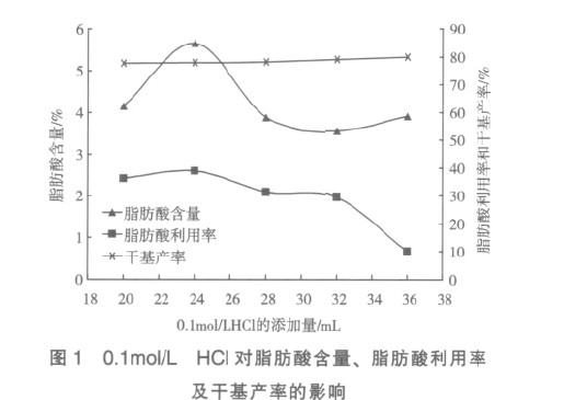 繼續(xù)增加 HCl 的量,脂肪酸含量開始下降。 另外, 脂肪酸利用率也在 HCl 的用量為 24mL 時達到最大值。干基產(chǎn)率基本不受酸量的影響,無明顯變化。直鏈淀粉在溶液中形成外親水內(nèi)疏水的螺旋結(jié)構(gòu), 脂肪酸依靠疏水相互作用進入直鏈淀粉螺旋結(jié)構(gòu),因此穩(wěn)定直鏈淀粉的螺旋結(jié)構(gòu)、降低脂肪酸的溶解親水性及提高脂肪酸的疏水性 對促進復合物的形成是極為有利的。脂 肪 酸 在0.01mol/L KOH 溶液中形成溶解親水性較好的鉀鹽,隨著鹽酸的加入脂肪酸鉀鹽轉(zhuǎn)變?yōu)殡y溶和疏水性的脂肪酸,從而促進脂肪酸與直鏈淀粉的疏水相互作用形成復合物。但鹽酸的加入過多也會造成脂肪酸溶解性太差,不利于脂肪酸和直鏈淀粉分子間的充分接觸; 過多酸也會引起淀粉的水解導致螺旋結(jié)構(gòu)破壞, 從而影響復合物的形成。從試驗結(jié)果來看,200mL0.01mol/LKOH 溶液體系中加入 24mL的 0.1mol/LHCl 溶液, 確保體系適當偏酸性是較為適宜的,這與 Hahn 和 JohnKarkalas 等人所做的研究結(jié)果一致。