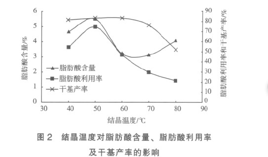 0.1mol/L HCl 溶液用量固定為 24mL, 研究不同結(jié)晶溫度下保溫 3h 對亞油酸-直鏈淀粉復合物的的影響, 試驗結(jié)果如圖 2 所示。由圖 2 可知: 隨著結(jié)晶溫度的升高,復合物的脂肪酸含量、脂肪酸利用率在 50℃時達到最高。 干基產(chǎn)率在40~60℃變化不大, 但超過 60℃后明顯下降。 因此,適宜的結(jié)晶溫度為 50℃。脂肪酸與直鏈淀粉通過疏水相互作用形成復合物吸熱過程, 加熱有利于復合物的形成。 較高溫度也使淀粉和脂肪酸分子活動性增強,使直鏈淀粉與均勻分散的脂肪酸相互并攏形成更多的復合物。 然而太高的溫度也不可取, 因其易使直鏈淀粉糊化, 螺旋結(jié)構(gòu)破壞, 進而影響了復合物的形成。