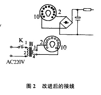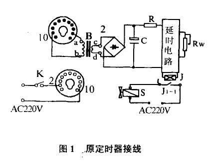 定時(shí)器(TE)的電壓端是通過堿泵控制開關(guān)K接人定時(shí)器管座的2,10兩腳,插頭相應(yīng)的2,10兩腳接定時(shí)器內(nèi)部的電源變壓器B的a、b、次級(jí)c、d經(jīng)硅橋整流后給定時(shí)電路供電,其中D為硅橋,R、C為租容濾波元件,Rw為時(shí)間設(shè)定,J為定時(shí)器輸出控制繼電器,J1一1是J的控制觸頭,S為堿泵電機(jī),當(dāng)加堿時(shí)K閉合,AC220V經(jīng)管座接口進(jìn)人B的初級(jí),次級(jí)電壓整流濾波后供給定時(shí)器電路,設(shè)定時(shí)間到后,繼電器吸合,其觸頭l,4閉合啟動(dòng)加堿電機(jī),開始執(zhí)行加堿程序。改制方法:(圖2)先準(zhǔn)備一只3w一sw,22OV盡4V的小型變壓器B(小型錄音機(jī)電源變壓器也可),再將定時(shí)器內(nèi)的B拆除,將原B的二次線c、b兩端直接接人插頭的2,10兩端,原管座上的2,10兩端拆下,并將這兩點(diǎn)直接接到B的初級(jí)1,2兩端,B的次級(jí)3,4兩端接管座的2,10兩端,將B利用原定時(shí)器旁邊接線排的固定螺絲就近固定,通過這樣處理后,定時(shí)器已使用兒年未出現(xiàn)過問題。應(yīng)當(dāng)注意的是:如果原機(jī)中其余兒個(gè)定時(shí)器還未改過,那應(yīng)當(dāng)特別注意,改動(dòng)過與未改動(dòng)過的定時(shí)器之間不可互換,否則會(huì)使工作不正;蛘邿龎,改動(dòng)過后應(yīng)當(dāng)標(biāo)上特別標(biāo)記。