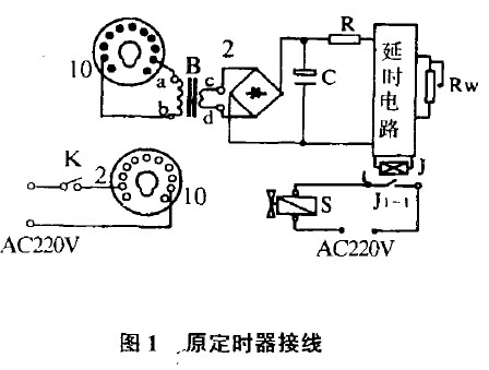 在有加堿指令時(shí),加堿泵不工作。在儀器中有四只相同的(305)定時(shí)器,外型為插人式大11腳封裝,所以在需要更換時(shí)顯得特別方便,型號(hào)為SA46720,工作電壓為AC22OV,國(guó)內(nèi)沒(méi)有相同產(chǎn)品,曾與儀器生產(chǎn)廠家聯(lián)系,這種型號(hào)廠家早已不生產(chǎn)了,經(jīng)我們拆開(kāi)檢查,發(fā)現(xiàn)是定時(shí)器TE的供電變壓器B,(220V/24碼燒壞,但定時(shí)電路完好,這種小型變壓器由于體積很小,國(guó)產(chǎn)最小的產(chǎn)品也不能裝人,以前我們?cè)鴥捍沃乩@,由于休積小,電壓高,重繞后也維持不了多久,后來(lái),我們將其部分電路稍加改動(dòng)后,即徹修復(fù),見(jiàn)圖1,定時(shí)器(TE)的電壓端是通過(guò)堿泵控制開(kāi)關(guān)K接人定時(shí)器管座的2,10兩腳,插頭相應(yīng)的2,10兩腳接定時(shí)器內(nèi)部的電源變壓器B的a、b、次級(jí)c、d經(jīng)硅橋整流后給定時(shí)電路供電,其中D為硅橋,R、C為租容濾波元件,Rw為時(shí)間設(shè)定,J為定時(shí)器輸出控制繼電器,J1一1是J的控制觸頭,S為堿泵電機(jī),當(dāng)加堿時(shí)K閉合,AC220V經(jīng)管座接口進(jìn)人B的初級(jí),次級(jí)電壓整流濾波后供給定時(shí)器電路,設(shè)定時(shí)間到后,繼電器吸合,其觸頭l,4閉合啟動(dòng)加堿電機(jī),開(kāi)始執(zhí)行加堿程序。
