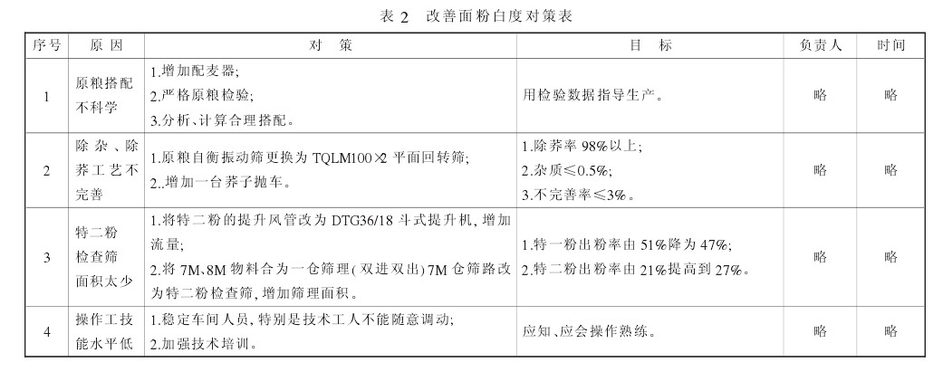 2) 加強(qiáng)職能管理。為徹底改善面粉白度指標(biāo),我們根據(jù)對策表, 全面制定整改計(jì)劃。