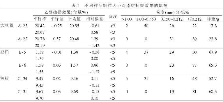 在現(xiàn)行國(guó)家標(biāo)準(zhǔn)GB/T 6433- 1994《飼料粗脂肪測(cè)定方法》中,脂肪成分的提取主要是通過將樣品浸泡在抽提溶劑中由抽提溶劑洗滌樣品來實(shí)現(xiàn)的。樣品顆粒的大小直接影響到樣品能和抽提溶劑接觸的廣度和深度,這將直接影響到所測(cè)樣品脂肪成分的提。ㄝ腿。┬。通常在相同的試驗(yàn)條件卜,樣品顆粒越小,脂肪成分的提。ㄝ腿。┬试礁,所測(cè)得樣品的脂肪含量也會(huì)高一些。在日常檢驗(yàn)工作中,有時(shí)懷疑因樣品研磨不夠細(xì)致而導(dǎo)致檢測(cè)結(jié)果偏低。木文以現(xiàn)行國(guó)家標(biāo)準(zhǔn)GB/T 6433- 1994規(guī)定的0.45 mm(40目)顆粒大小為基礎(chǔ),隨機(jī)選用魚粉原樣(即未經(jīng)任何磨制)和經(jīng)日常研磨方式(KNIFETEC 1095型磨樣機(jī),選2s或Ss模式,運(yùn)轉(zhuǎn)次數(shù)視樣品性狀而定)制備的大豆粉、豆粕樣品作為試驗(yàn)組。對(duì)所有實(shí)驗(yàn)樣品分別用1 mm X18目), 0.45 mm X40目), 0.212mm(70目)標(biāo)準(zhǔn)篩篩分檢查樣品顆粒大小的分布情況,詳見表1.對(duì)將作為參照組的樣品,如有0.45~篩上物的增加磨制時(shí)間,直到全部過0.45~篩。然后,對(duì)所有樣品用乙醚作抽提溶劑。浸泡15min,淋洗45min進(jìn)行脂肪含量檢測(cè)。