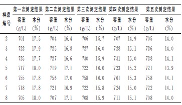 選。阜萦衩讟悠罚渲校阂坏龋捶,二等4份,水分均在20.0%左右。采用自然風干晾曬的方法降水,當水分降到18.0%左右時開始記錄水分及容重的變化,水分降到14.0%左右時結束試驗。之所以選擇18.0%~14.0%水分之間,是因為18.0%是GB1353-2009規(guī)定直接測定容重的水分,14.0%是GB1353-2009規(guī)定的標準水分,也是玉米的安全水分。玉米容重器對每份樣品在測定水分的同時測定容重,共記錄樣品5次測定結果的40組數(shù)據,然后匯總列表進行分析。