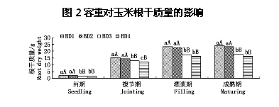 通過容重測定儀的研究分析,并結(jié)合圖2可知,在玉米生育期內(nèi),根干質(zhì)量也呈上升趨勢,根量最大增長發(fā)生在苗期至拔節(jié)期時(shí)段,不同處理的增長率分別為561%,584%,649%,655%,最小增長率發(fā)生在灌漿期至成熟期,增長率分別為2.4%,2.8%,1.2%,2.2%?梢,到灌漿期根系發(fā)育基本成熟,此時(shí)主要進(jìn)行營養(yǎng)物質(zhì)的積累。對比前面有關(guān)數(shù)據(jù),雖然成熟期根系體積、表面積、長度比灌漿期有所下降,但其干質(zhì)量卻有小幅度上升,這是因?yàn)楦的举|(zhì)化,干物質(zhì)積累上升所致。BD1與BD2處理在生育期內(nèi)根干質(zhì)量差異未達(dá)顯著水平,但都極顯著(P<0.01)高于BD3與BD4處理。